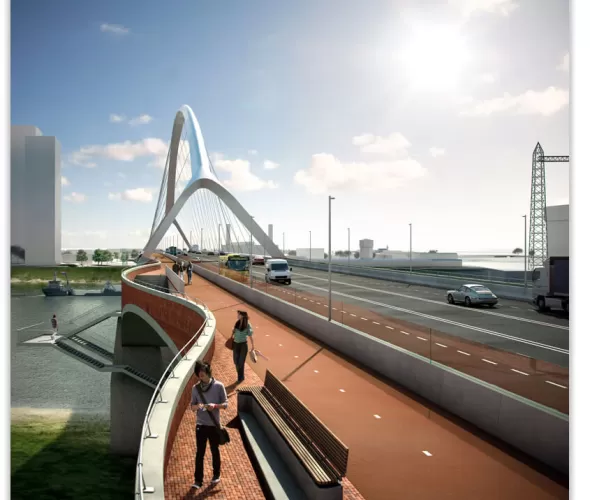 Tevens heeft Pouma Engineering een belangrijk aandeel in de bouw van ‘De Oversteek’, de nieuwe stadsbrug van Nijmegen. De 1200m lange stadsbrug heeft een hoofdoverspanning van 285m en weegt 6000 ton. Mans: "In de rol van architect hebben we een BIM model opgezet waarbij we de stadsbrug en de hele omgeving van Nijmegen driedimensionaal hebben gemodelleerd in Tekla. Details zoals de metselwerkpanelen, dekstenen, trappen en aanbruggen zijn daarbij volledig uitgewerkt. Het extensieve model is onder andere gebruikt voor uitvoeringsstudies, het geven van advies en het genereren van tekeningen."