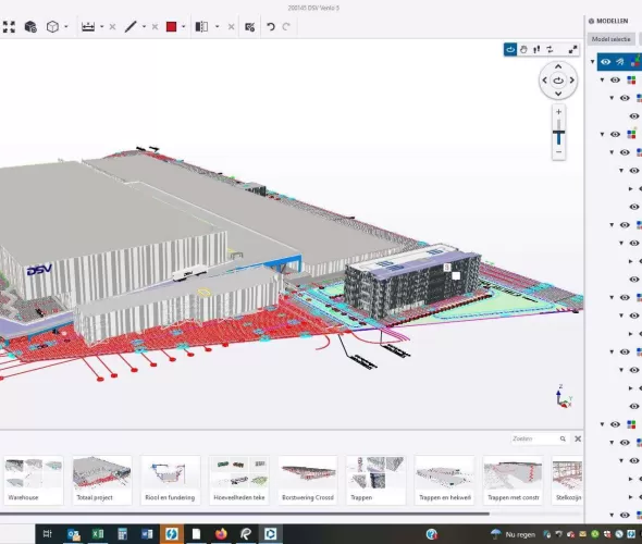 DSV Venlo 5 is alweer het vijfde project dat Unibouw voor DSV uitvoert. Tijdens de uitvoering van het project heeft Meeuws optimaal gebruikgemaakt van Trimble Connect. “Het project DSV Venlo 5 bestaat uit vier verschillende gebouwen, waaronder een hoofdkantoor, parkeergarage, crossdock en een warehouse, bestaande uit twee logistieke hallen op elkaar van 26 m hoog”, legt Meeuws uit. “Al deze losse gebouwen hadden een apart model. Met behulp van Trimble Connect heb ik de informatie kunnen samenvoegen en gestructureerd weggezet. Dit gaat heel makkelijk doordat de mappenstructuur in Trimble Connect vergelijkbaar is met de Windows Verkenner.”