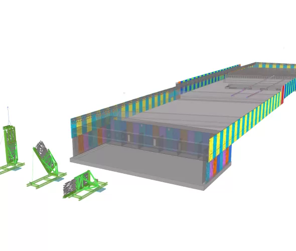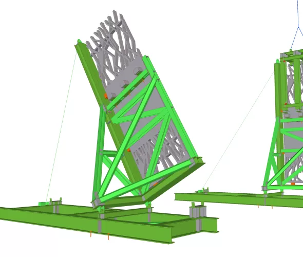 De laatste stap van het proces was het vervoeren en plaatsen van de randelementen. Hulsbergen: “De grootste uitdaging zat denk ik in het verzinnen van een manier om de elementen heel uit de kist te krijgen, te transporteren, te kantelen en de elementen te hijsen zonder dat deze beschadigd raken. Aan de dunne structuur kan namelijk niet worden gehesen of op worden gesteund of gekanteld. Door het proces te simuleren in het Tekla Structures-model zijn we hierin geslaagd.”