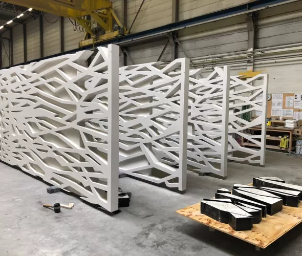 Tijdens het project werd er met verschillende partijen nauw samengewerkt. De nauwkeurige uitwerking, uitwisseling aan de hand van 3D-modellen en exportbestanden voor de mallenmaker en wapeningsleverancier hebben gezorgd dat alles juist geproduceerd en gemonteerd is. De informatie-uitwisseling met de mallenmaker en de wapeningsleverancier verliep in alle gevallen via een DWG-export van de elementen vanuit Tekla Structures waarbij IFC-modellen gebruikt werden voor extra inzicht. De mallenmaker zette vervolgens voor het uitfrezen van de malbodem de DWG-export van de vorm om naar een CNC-freesbestand waarmee de machine direct werd aangestuurd. Om alle takken te voorzien van een wapeningstaaf, rekening houdend met kruisingen, was er een structuur van drie lagen nodig. Deze konden door de wapeningsleverancier exact worden overgenomen vanuit de export en worden samengevoegd tot één net, waarbij elke tak minimaal één thermisch verzinkte wapeningsstaaf in het midden heeft liggen. Om vervolgens de randelementen aan te laten sluiten aan het dek werden de IFC-modellen aangeleverd bij de hoofdaannemer welke de controle op hoofdmaatvoering en koppeling op het dek uitvoerde. Het stekkenplan werd wel aangeleverd in DWG-formaat. “Maar ook dat was goed in te laden”, vertelt Hulsbergen. “Zo konden we ook direct een clash-controle uitvoeren, waardoor we tijdens de bouw alles goed op elkaar aansloot en we niet voor verrassingen kwamen te staan.”