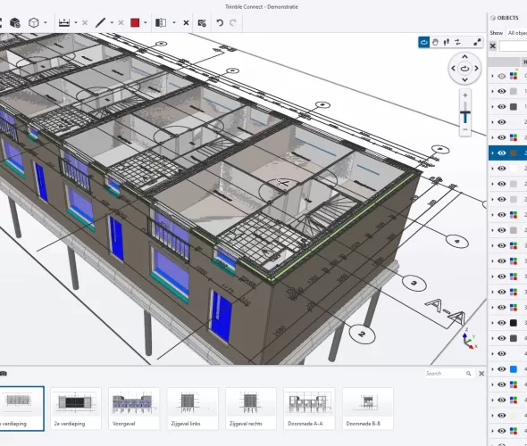 Ook bij Van der Heijden lag projectinformatie overal verspreid, in verschillende versies met onduidelijke informatie. “Bij Van der Heijden zijn we op locatie aan de slag gegaan om Trimble Connect te implementeren. We hebben medewerkers persoonlijk begeleid en hen wegwijs gemaakt hoe ze met het programma uit de voeten kunnen. Bijvoorbeeld bij het maken van templates, of hoe de rollen en rechten van de leden van het projectteam geregeld kunnen worden. We zijn met een paar projecten gestart als pilot en die bleken uitstekend te draaien. In Trimble Connect is het makkelijk om verschillende informatiepakketten, ofwel de vensters, als een set klaar te zetten. Bijvoorbeeld een 3D-model gecombineerd met een 2D-tekening. Hierdoor kan deze complete informatie snel gedeeld worden met het bouwteam”, legt Kuiters uit.