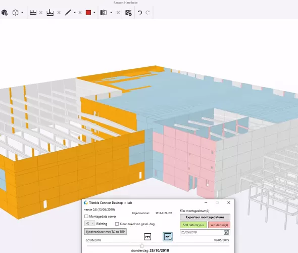 De tool die Stadsbader ontwikkelde bovenop Trimble Connect biedt door middel van een kleurenlegenda onder meer inzicht in welke elementen in productie zijn en welke ingepland staan, of reeds geproduceerd, geleverd of gemonteerd zijn. Van Laethem: “Tijdens de uitvoering werden bovendien de diverse detailleringen en moeilijke bouwknopen digitaal van dichtbij bekeken en voorbereid. Zo konden we bijvoorbeeld de montagevolgorde van bepaalde prefab betonelementen eerst op het scherm bekijken, waardoor trial-and-error op de bouwplaats maximaal werd vermeden. Het plannen verliep hierdoor uitermate efficiënt en we konden te allen tijde zien of we nog goed op schema lagen.”