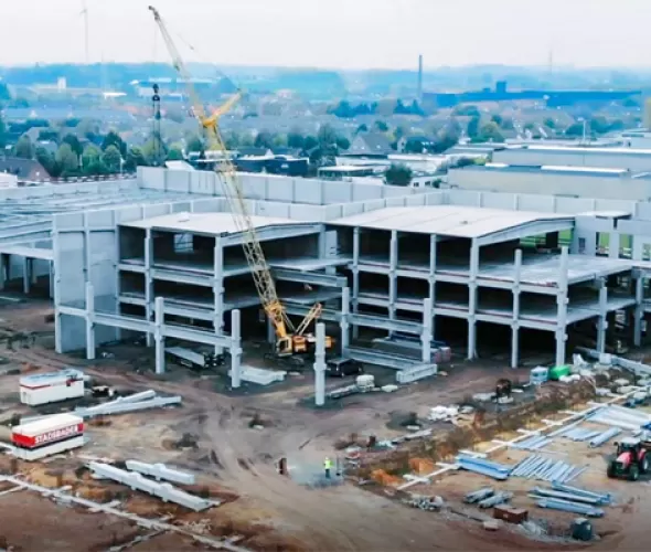 “Om dit ambitieuze project kostenefficiënt en tijdig te realiseren, opteerden de partners om te bouwen in prefab beton”, vertelt Yannick van Laethem, project engineer bij Stadsbader. “De keuze voor prefab beton, in combinatie met het opzetten van een 3D-model, zorgt ervoor dat we sneller en met minder fouten kunnen produceren. Daarnaast hebben we meer grip op de planning van productie en bouw en zijn we niet afhankelijk van weersinvloeden. Een bijkomend pluspunt was dat de productielocatie van het prefab beton op nog geen half uur rijden ligt van de bouwplaats, waardoor ook de CO2-uitstoot van het transport tot een minimum werd beperkt.”