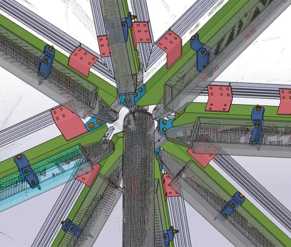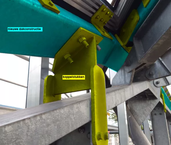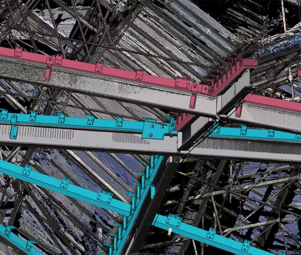 Het team wist de puntenwolken uit de scans samen te voegen tot één betrouwbaar model dat de basis werd voor de volledige engineering in Tekla Structures. Ligthart: “Alle nieuwe onderdelen zijn virtueel ingepast, zodat we vooraf wisten of alles zou passen. Zelfs de vervorming van de oude constructie na het verwijderen van het oude dak hebben we kunnen voorspellen.”