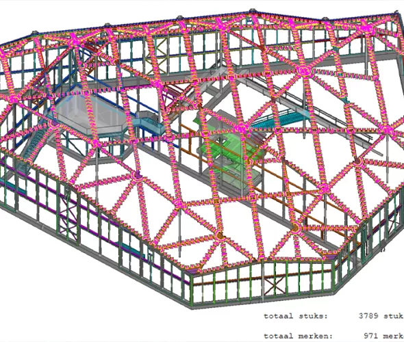 Alleen al voor de bevestiging van het dak werden 4.400 unieke beugels geproduceerd, elk met een eigen hoek, lengte en zetting. Ligthart: “Deze hebben we allemaal in Tekla Structures gemodelleerd en via een CAD-workflow naar onze kantbanken gestuurd. Daardoor kon elk onderdeel exact worden gemaakt zoals bedoeld. Zonder dat model was dat ondenkbaar geweest.”