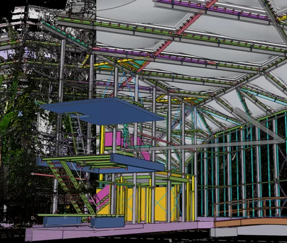 Vic Obdam werd al in de ontwerpfase bij het project betrokken om het schetsontwerp naar een definitief ontwerp te brengen. “De bestaande staalconstructie bleef behouden. Daarom hebben we het hele gebouw met onze eigen FARO-scanner in kaart gebracht”, vertelt Thomas Ligthart, tekenaar en technisch beheerder bij Vic Obdam. “Dat was een flinke uitdaging, want toen we begonnen, stond de kas nog vol met bomen tot aan het dak. Die bewogen voortdurend door de ventilatie, wat het koppelen van de scans moeilijk maakte.”